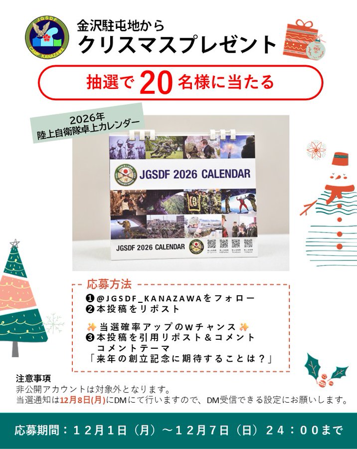 【X懸賞】卓上カレンダーを20名様にプレゼント 2025.12.06陸上自衛隊金沢駐屯地‐フォロー&リポストキャンペーン 賞品:卓上カレンダー(20名様) 締切:2025年12月7日(日)公式X(Twitter)アカウントをフォロー&キャンペーン対象ポストをリポストしてご応募ください。※詳細はキャンペーンページにてご確認ください。応募はこちらから