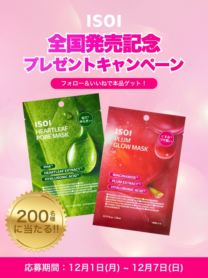 賞品:ISOI プラム グロー マスク 1枚、ドクダミ ポア マスク 1枚(200名様)