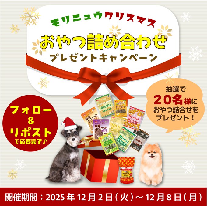 賞品:森乳サンワールドの犬用おやつ詰め合わせ(20名様)