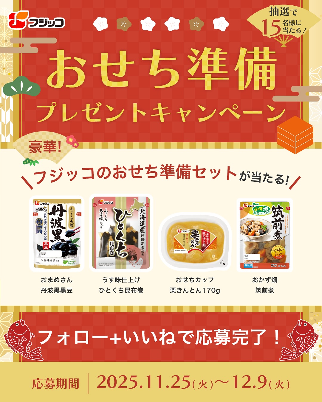 【Instagram懸賞】フジッコおせち準備セットを15名様にプレゼント 2025.12.08フジッコおせち準備キャンペーン 賞品:フジッコおせち準備セット(15名様) 締切:2025年12月9日(火)応募方法: 1. 公式Instagramアカウントをフォロー 2. 対象の投稿に「いいね!」※詳細はキャンペーンページにてご確認ください。応募はこちらから