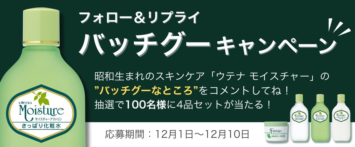フォロー&リプライで「#ウテナモイスチャー の”バッチグーなところ”」を投稿すると、抽選で100名様に4品セットが当たる❣️