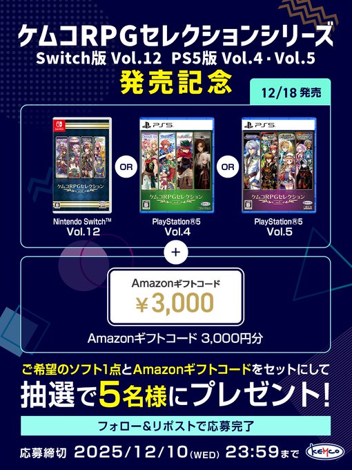 賞品:「ケムコRPGセレクション」Switch版 Vol.12 PS5版Vol.4、Vol.5+Amazonギフトコード(5名様)