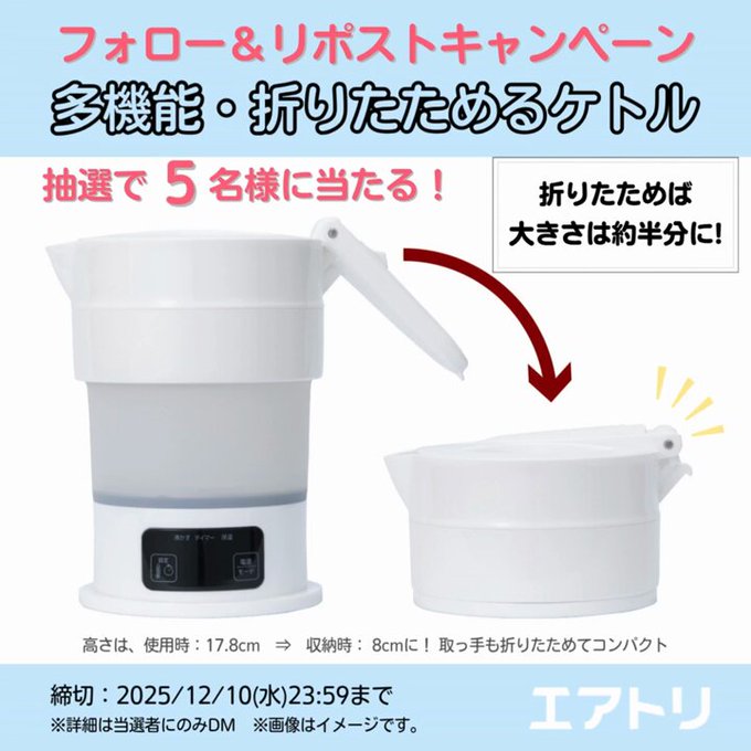 賞品:多機能折りたためるケトル(5名様)