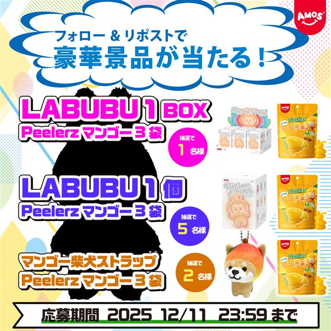 賞品:THE MONSTERS (LABUBU) Big into Energyや柴犬ストラップとPeelerzマンゴーの豪華セット(8名様)