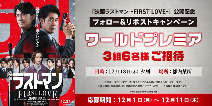 賞品:『映画 ラストマン -FIRST LOVE-』ワールドプレミアご招待(3組6名様)