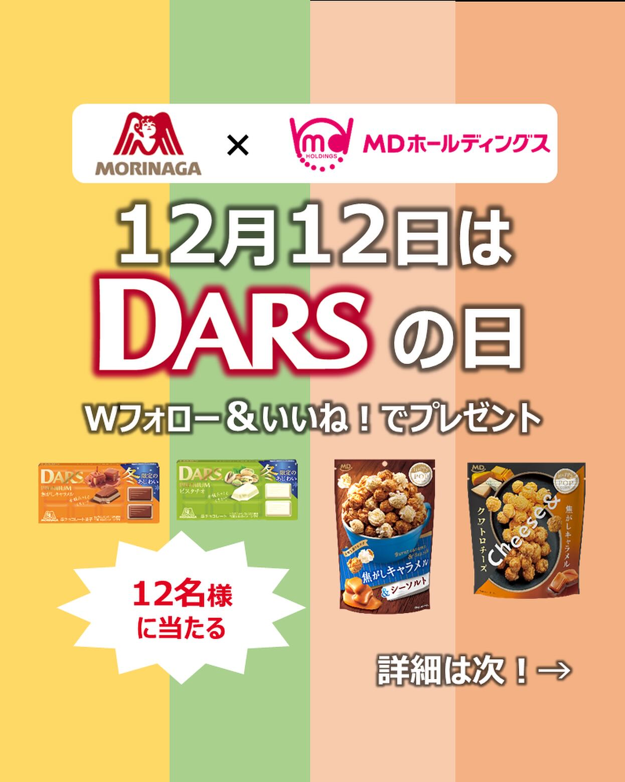 賞品:森永製菓 DARS2品&MDホールディングス ハッピーポップコーン2品 詰め合わせ(12名様)