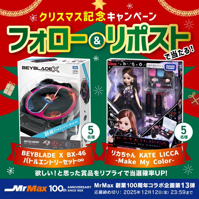 賞品:BEYBLADE X BX-46 バトルエントリーセット∞、リカちゃん KATE LICCA -Make My Color-(合計10名様)