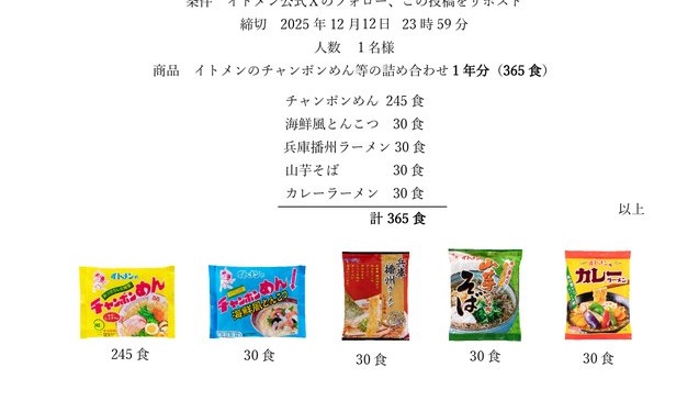 【X懸賞】イトメンのチャンポンめん等1年分を1名様にプレゼント 2025.12.11イトメン‐フォロー&リポストキャンペーン 賞品:チャンポンめん等1年分(1名様) 締切:2025年12月12日(金)公式X(Twitter)アカウントをフォロー&キャンペーン対象ポストをリポストしてご応募ください。※詳細はキャンペーンページにてご確認ください。応募はこちらから