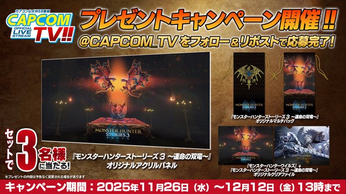 賞品:『モンスターハンターストーリーズ3 ~運命の双竜~』と『モンスターハンターワイルズ』のオリジナルグッズセット(3名様)
