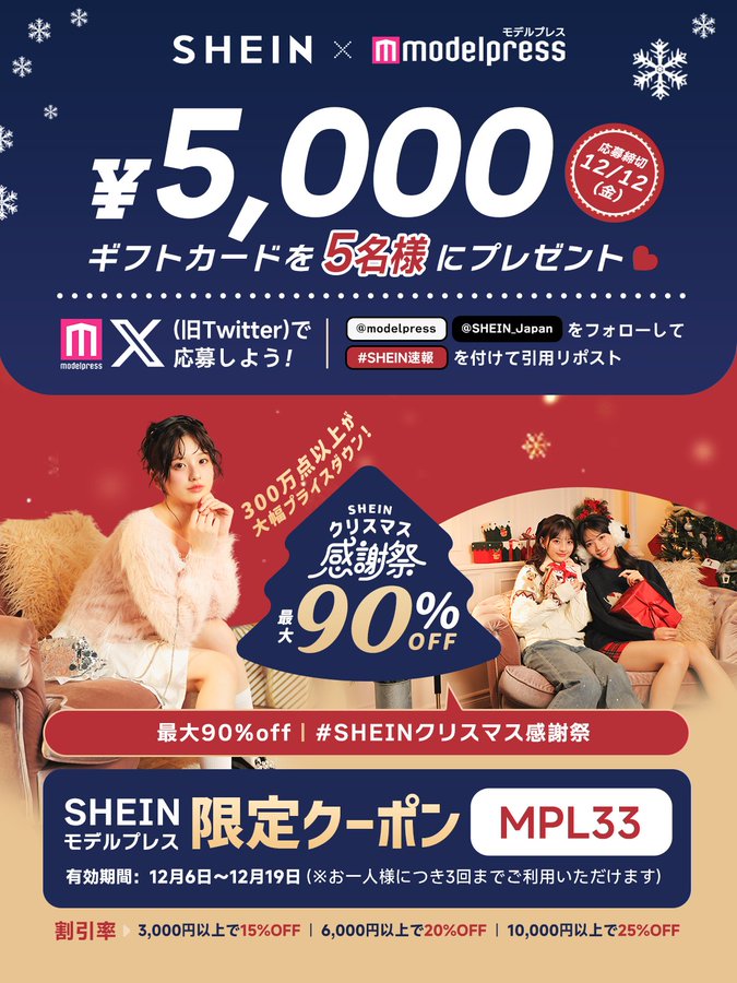 【X懸賞】SHEINギフトカード5,000円分を5名様にプレゼント