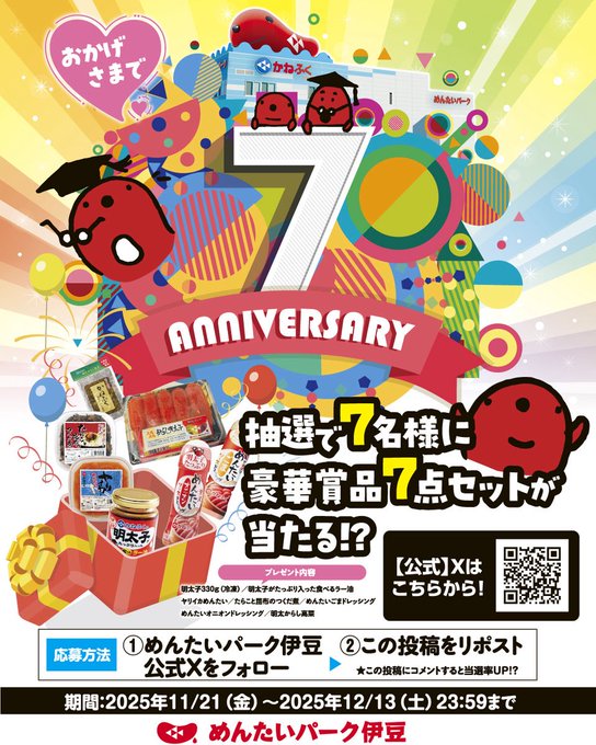 【X懸賞】賞品7点セットを7名様にプレゼント 2025.12.11かねふくめんたいパーク伊豆‐フォロー&リポストキャンペーン 賞品:賞品7点セット(7名様) 締切:2025年12月13日(土)公式X(Twitter)アカウントをフォロー&キャンペーン対象ポストをリポストしてご応募ください。※詳細はキャンペーンページにてご確認ください。応募はこちらから