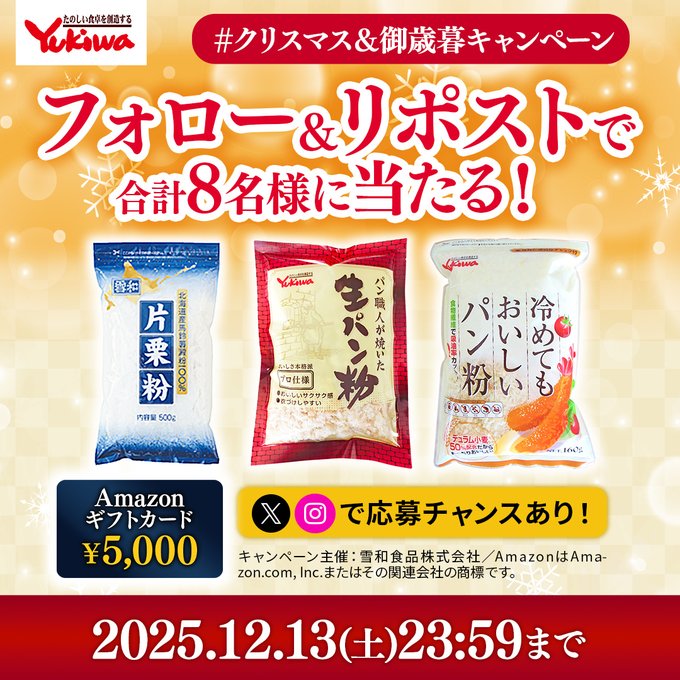 賞品:雪和パン粉、片栗粉、Amazonギフト券5,000円分(合計8名様)