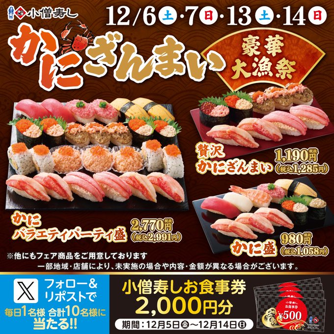 小僧寿し公式X(Twitter)アカウントをフォロー&キャンペーン対象ポストをリポストしてご応募ください。