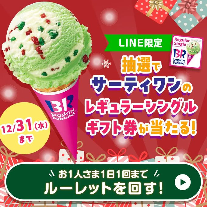 【毎日・LINE懸賞】サーティワンのレギュラーシングルギフト券がその場で当たる! 2025.12.11キッズリパブリック‐LINE公式アカウント抽選キャンペーン 賞品:サーティワンのレギュラーシングルギフト券 締切:2025年12月31日(水)キッズリパブリック公式LINE友だちの方限定で、期間中1日1回抽選に参加できます!※詳細はキャンペーンページにてご確認ください。応募はこちらから