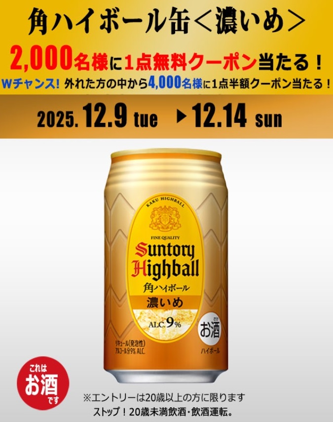 賞品:「角ハイボール缶<濃いめ>350ml」1点無料クーポン(2,000名様)