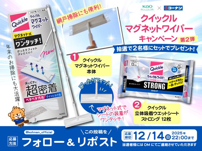 賞品:花王クイックル マグネットワイパー&立体吸着ウェットシートストロング(2名様)