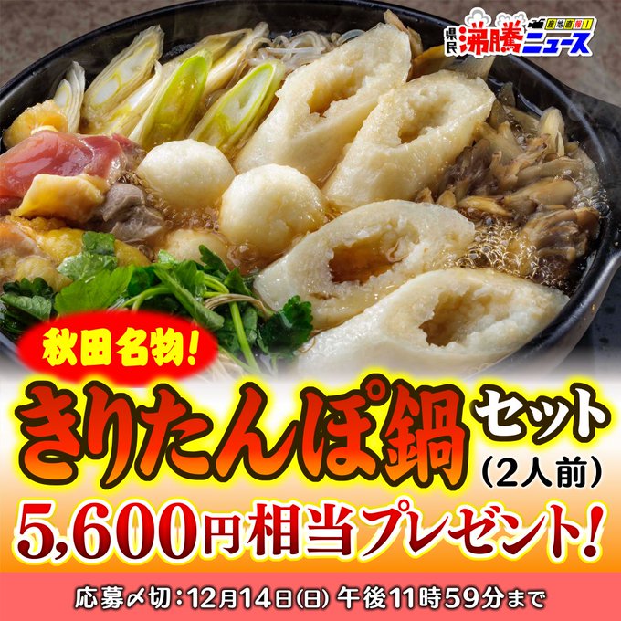 【X懸賞】きりたんぽ鍋セットを3名様にプレゼント 2025.12.11旬感LIVEとれたてっ!‐プレゼントキャンペーン 賞品:秋田名物!きりたんぽ鍋セット(3名様) 締切:2025年12月14日(日)応募方法 ①『#とれたてっ!』公式Xをフォロー ②投稿をリポストまたは引用リポスト※詳細はキャンペーンページにてご確認ください。応募はこちらから