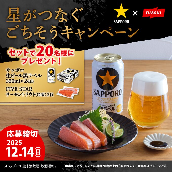 賞品:サッポロ 生ビール黒ラベルとニッスイのFIVE STARサーモントラウト(20名様)