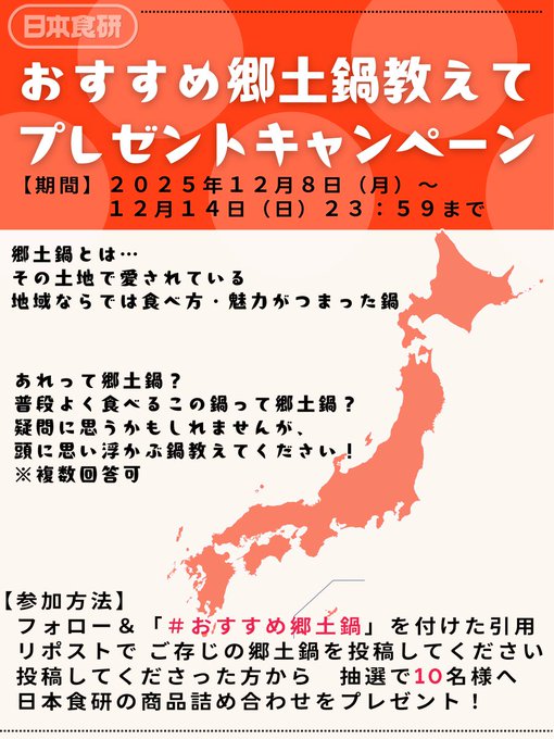 【X懸賞】日本食研の商品詰め合わせを10名様にプレゼント 2025.12.12日本食研‐おすすめ郷土鍋教えて #キャンペーン 賞品:日本食研の商品詰め合わせ(10名様) 締切:2025年12月14日(日)① アカウントをフォロー ② #おすすめ郷土鍋 をつけた引用リポストで、郷土鍋を投稿※詳細はキャンペーンページにてご確認ください。応募はこちらから