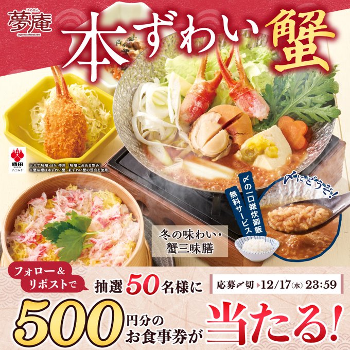 夢庵公式X(Twitter)アカウントをフォロー&キャンペーン対象ポストをリポストしてご応募ください。