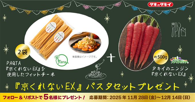 賞品:VegeTanaQのフィットチーネ『PAQTA』とタキイのニンジン『京くれないEX』(5名様)
