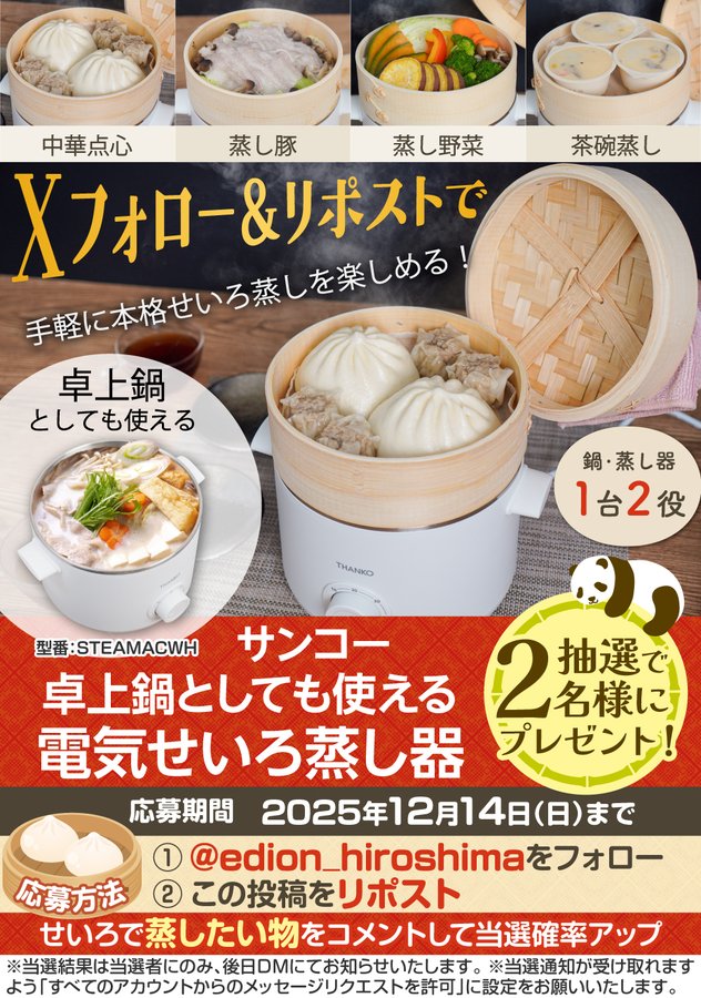 賞品:サンコー「卓上鍋としても使える電気せいろ蒸し器(STEAMACWH)」(2名様)