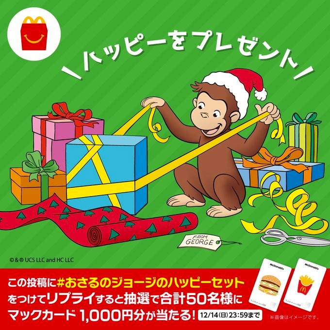 投稿に #おさるのジョージのハッピーセット をつけてリプライすると、抽選で合計50名様にマックカード1,000円分が当たる!