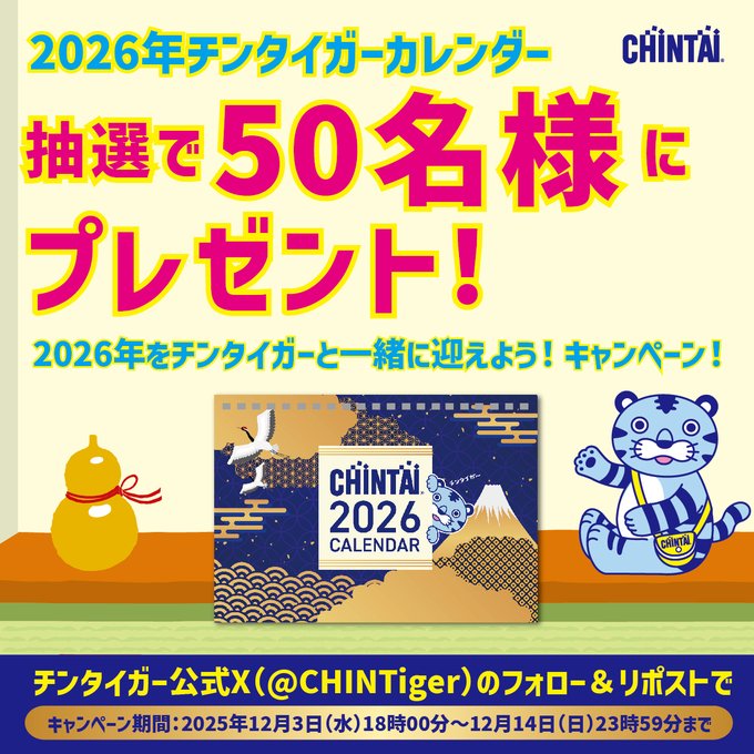 賞品:2026年度版チンタイガーカレンダー(50名様)