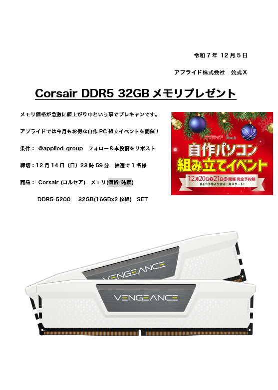 【X懸賞】Corsair メモリを1名様にプレゼント 2025.12.12アプライド‐フォロー&リポストキャンペーン 賞品:Corsair メモリ(1名様) 締切:2025年12月14日(日)公式X(Twitter)アカウントをフォロー&キャンペーン対象ポストをリポストしてご応募ください。※詳細はキャンペーンページにてご確認ください。応募はこちらから