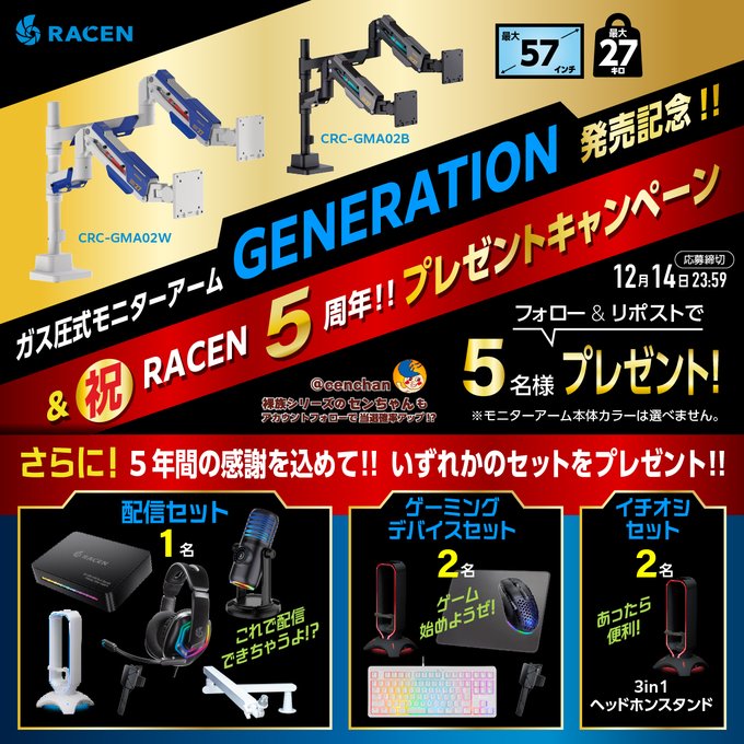 センチュリーPC ゲーミングモニターアーム「GENERATION」発売&祝 RACEN 5周年!記念 #プレゼントキャンペーン