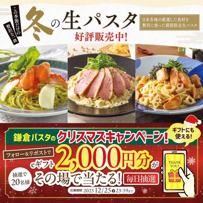 鎌倉パスタ公式X(Twitter)アカウントをフォロー&キャンペーン対象ポストをリポストしてご応募ください。