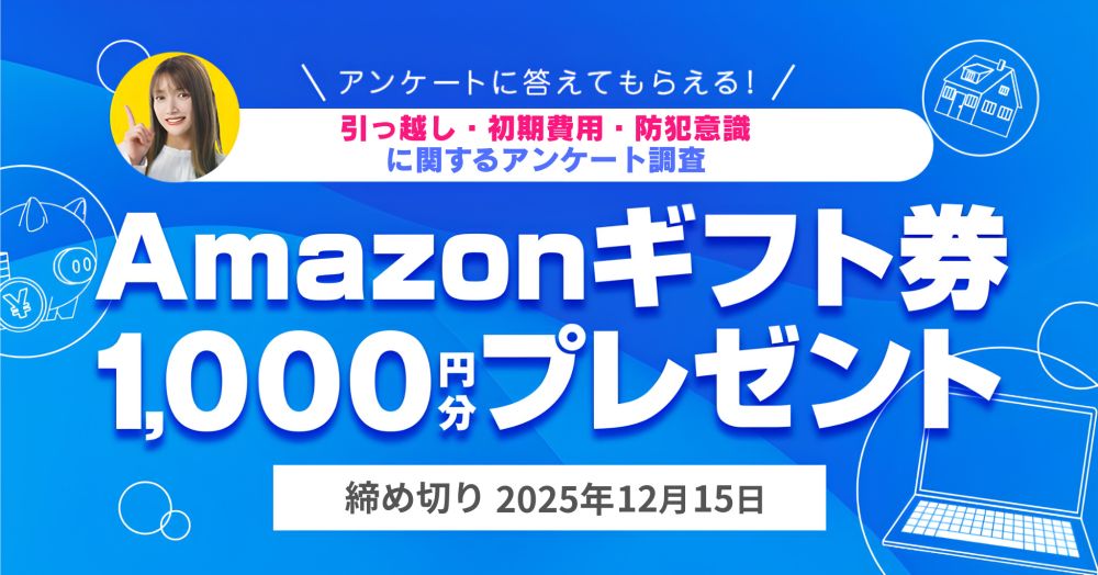 Amazonギフト券1,000円分を50名様にプレゼント 2025.12.12いえらぶ不動産コラム‐引っ越し・初期費用・防犯意識に関する利用者意識調査 賞品:Amazonギフト券1,000円分(50名様) 締切:2025年12月15日(月)アンケートに答えてご応募ください。※詳細はキャンペーンページにてご確認ください。応募はこちらから