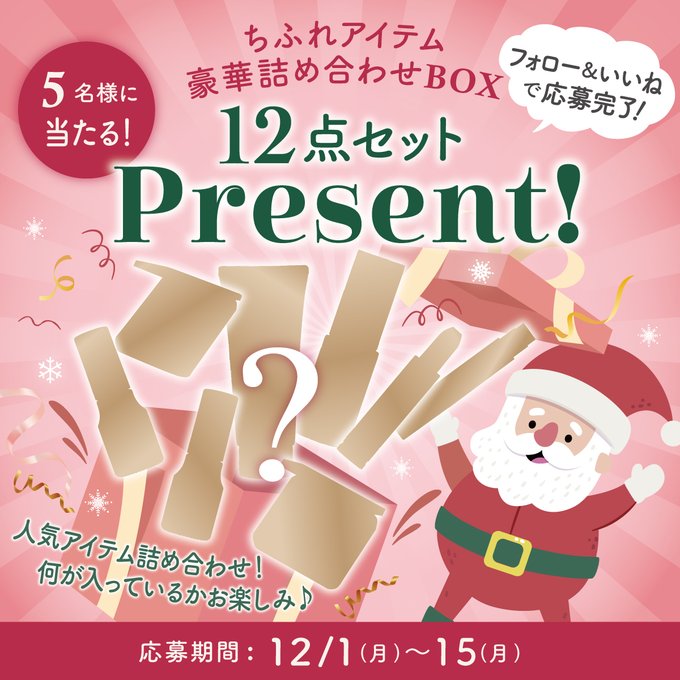 【X懸賞】ちふれアイテム豪華詰め合わせBOXを5名様にプレゼント 2025.12.13ちふれ‐プレゼントキャンペーン 賞品:ちふれアイテム豪華詰め合わせBOX(5名様) 締切:2025年12月15日(月)ちふれアイテム豪華詰め合わせBOX(12点セット)を5名様にプレゼント※詳細はキャンペーンページにてご確認ください。応募はこちらから