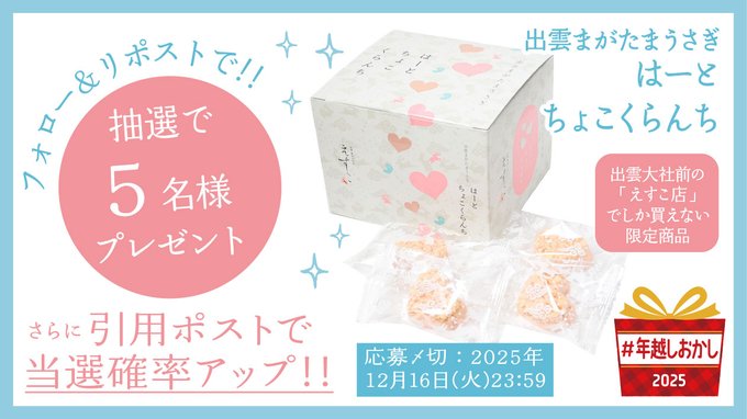 賞品:出雲大社前えすこ店オリジナルお菓子「出雲まがたまうさぎ はーとちょこくらんち」(5名様)