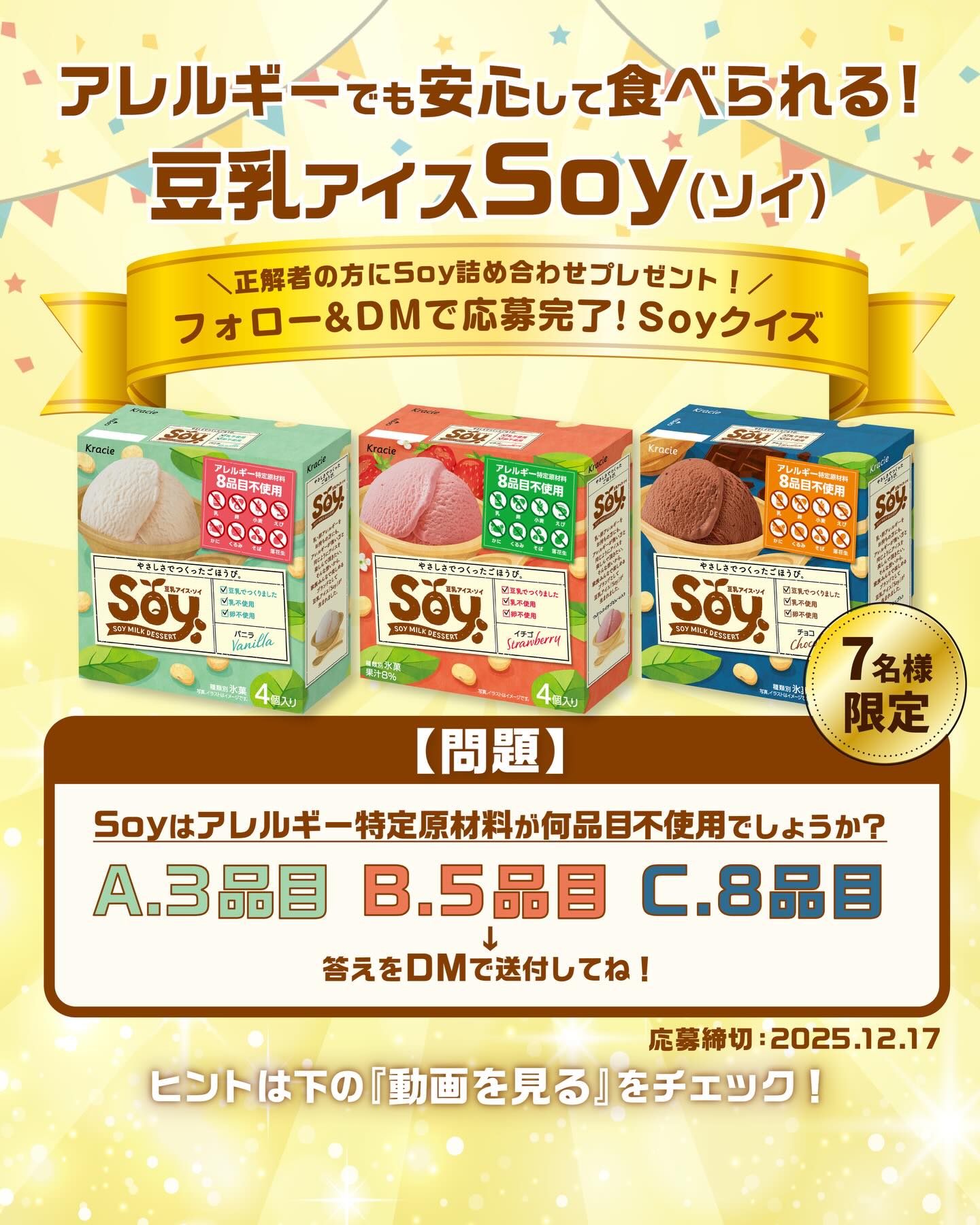 【Instagram懸賞】豆乳アイスSoy詰め合わせを7名様にプレゼント 2025.12.15クラシエ アイス‐クイズキャンペーン 賞品:豆乳アイスSoy(7名様) 締切:2025年12月17日(水)正解者の中から抽選でSoy詰め合わせをプレゼント!※詳細はキャンペーンページにてご確認ください。応募はこちらから