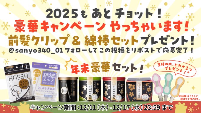 【X懸賞】前髪クリップと綿棒セットをプレゼント 2025.12.15綿棒の山洋‐フォロー&リポストキャンペーン 賞品:前髪クリップと綿棒セット 締切:2025年12月17日(水)公式X(Twitter)アカウントをフォロー&キャンペーン対象ポストをリポストしてご応募ください。※詳細はキャンペーンページにてご確認ください。応募はこちらから