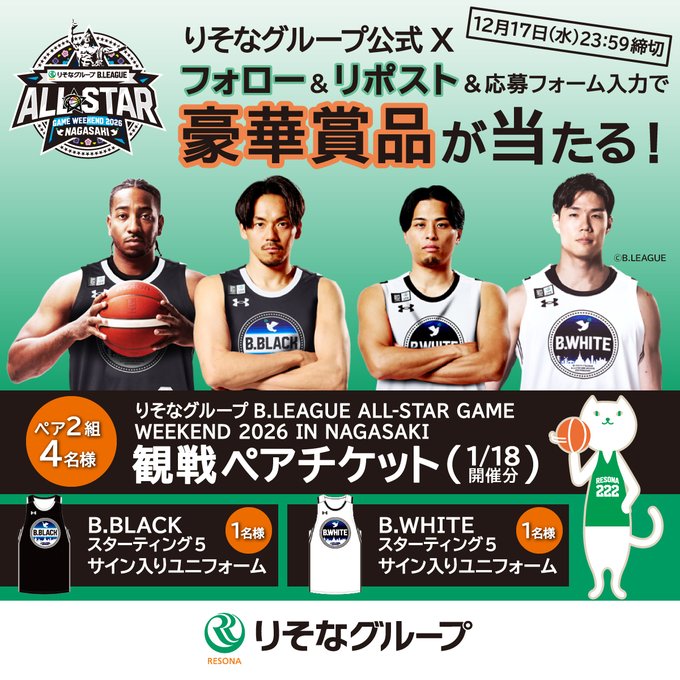 賞品:りそなグループ B.LEAGUE ALL-STAR GAME WEEKEND 2026 IN NAGASAKI 観戦ペアチケット、サイン入りユニフォーム(合計4名様)