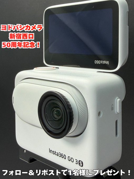 【X懸賞】Insta360 GO 3S 64GBを1名様にプレゼント 2025.12.16ヨドバシ新宿西口本店50周年記念‐プレゼントキャンペーン 賞品:Insta360 GO 3S 64GB(1名様) 締切:2025年12月18日(木)👉フォロー&リポスト👉普段何で動画を撮影しますか? リプライにて※詳細はキャンペーンページにてご確認ください。応募はこちらから