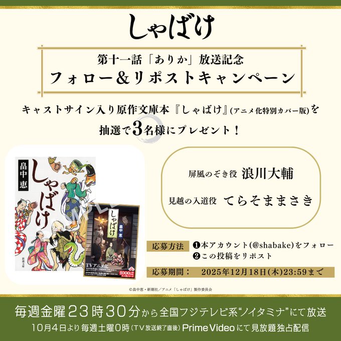 賞品:#浪川大輔 #てらそままさき サイン入りの原作文庫本「しゃばけ」(3名様)