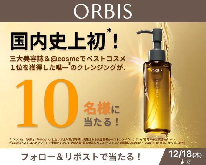 賞品:オルビス ザ クレンジング オイル(10名様)
