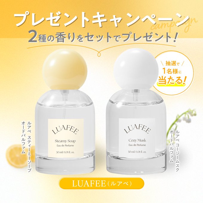 賞品:LUAFEE(ルアぺ)の「スティーミーソープ オードパルファム」「コージームスク オードパルファム」2種の香りセット(1名様)