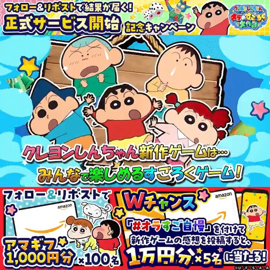 クレヨンしんちゃん オラのすごろく大作戦公式X(Twitter)アカウントをフォロー&キャンペーン対象ポストをリポストしてご応募ください。