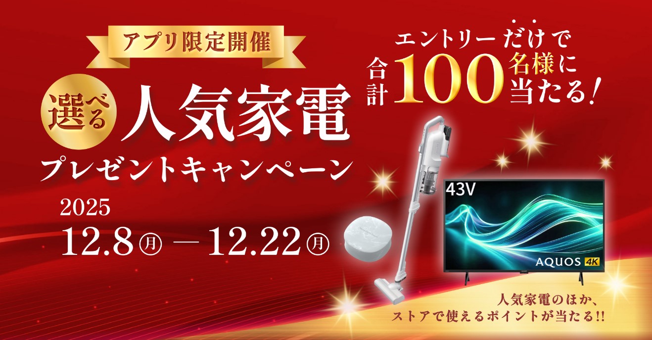 賞品:人気家電、ストアで使えるポイント(合計100名様)