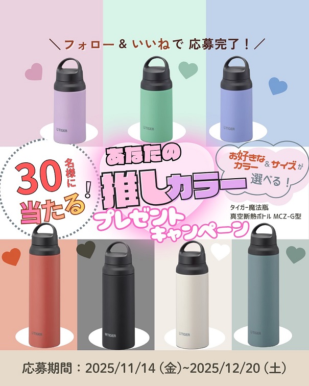 賞品:タイガー魔法瓶「真空断熱ボトル〈MCZ-G型〉」(30名様)
