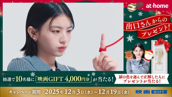 【X懸賞】映画GIFT4,000円分を10名様にプレゼント 2025.12.17アットホーム‐出口サンタの幸せつながるクリスマスキャンペーン 賞品:映画GIFT4,000円分(10名様) 締切:2025年12月19日(金)①@athome_coをフォロー ②ボタンを選んで投稿※詳細はキャンペーンページにてご確認ください。応募はこちらから