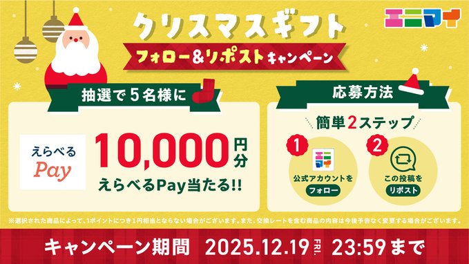 【X懸賞】えらべるPay10,000円分を5名様にプレゼント 2025.12.17エニマイ‐フォロー&リポストキャンペーン 賞品:えらべるPay1万円分(5名様) 締切:2025年12月19日(金)公式X(Twitter)アカウントをフォロー&キャンペーン対象ポストをリポストしてご応募ください。※詳細はキャンペーンページにてご確認ください。応募はこちらから