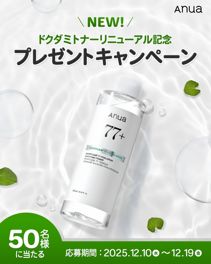 賞品:Anuaのロングセラー商品「ドクダミトナー」(50名様)