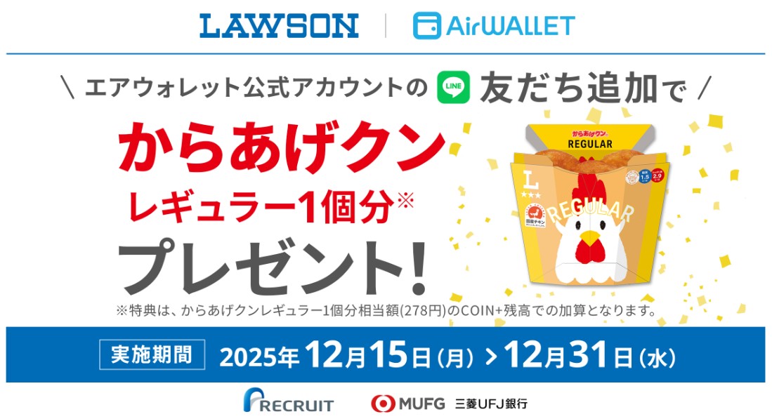 エアウォレット公式アカウント友だち追加とエアウォレットアプリダウンロードで、からあげクン レギュラー1個分(278円)のCOIN+残高をプレゼント。