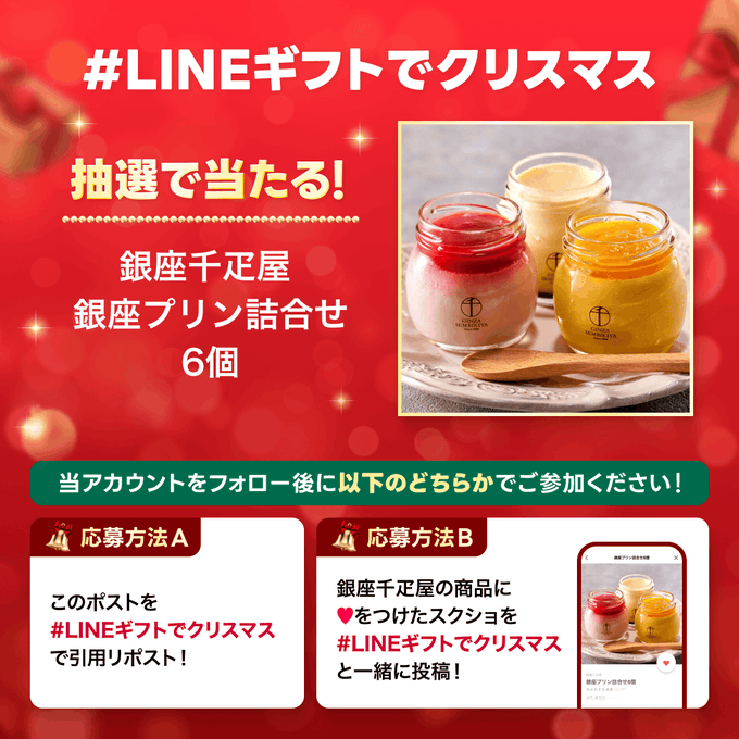 賞品:LINEギフトの「銀座プリン詰合せ6個」引換券URL(10名様)