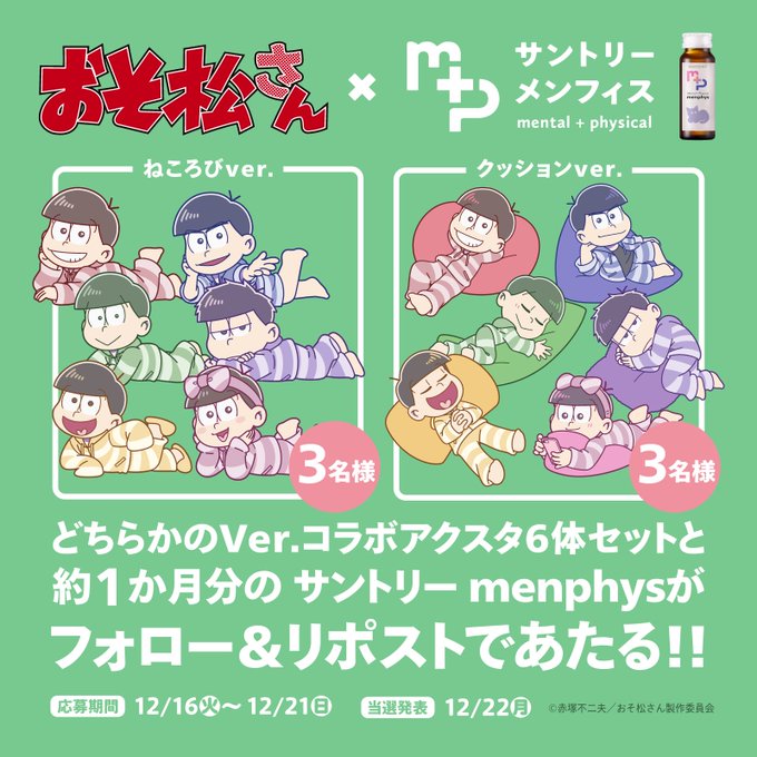 賞品:おそ松さんコラボ限定アクスタ+約1ヶ月分のmenphysスペシャルスターターセット無料クーポン(3名様)